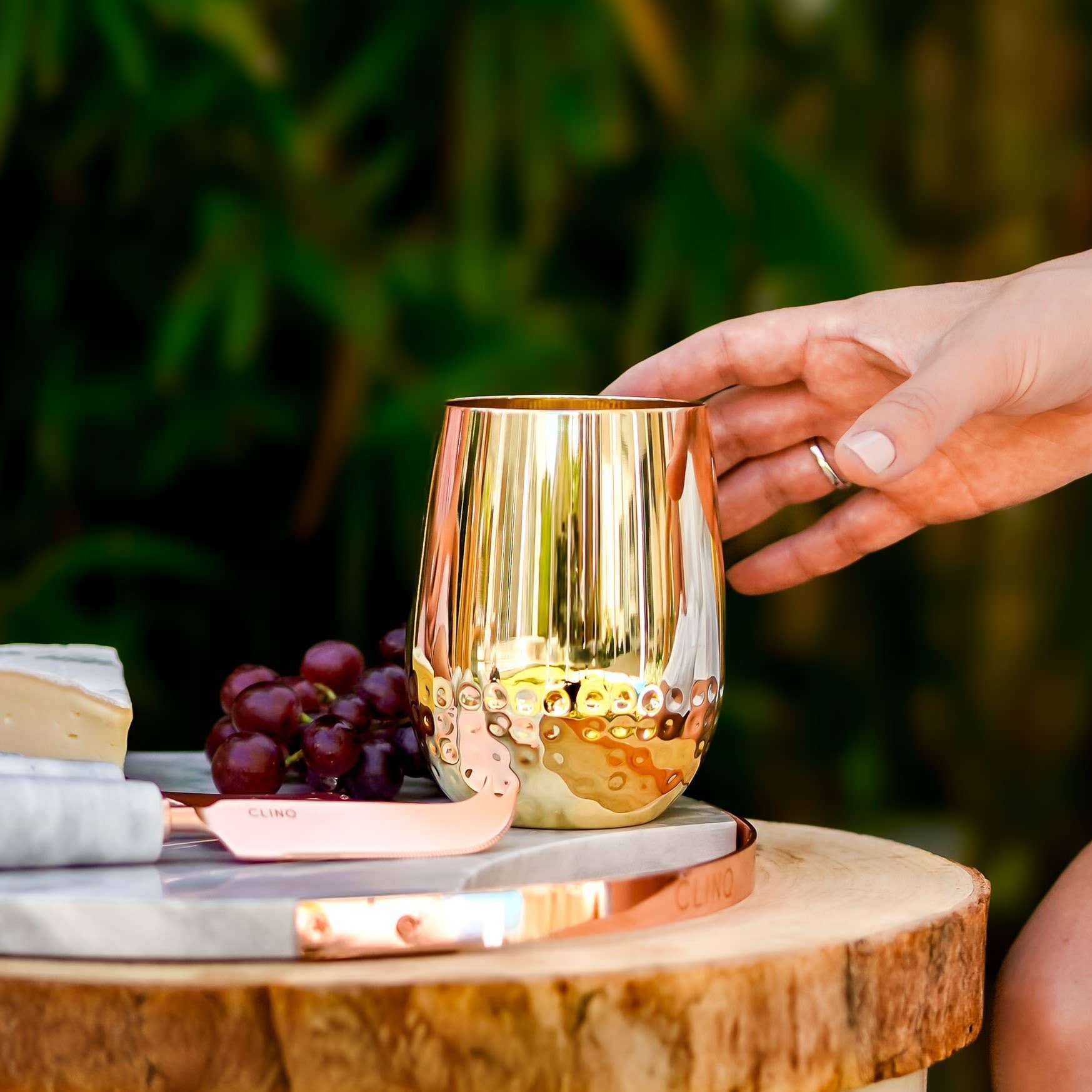 CLINQ’s gold glassware is gold plated inside and out. It is then coated with a clear, food-safe and durable coating that keeps your glassware gleaming and your drink tasting how it should.